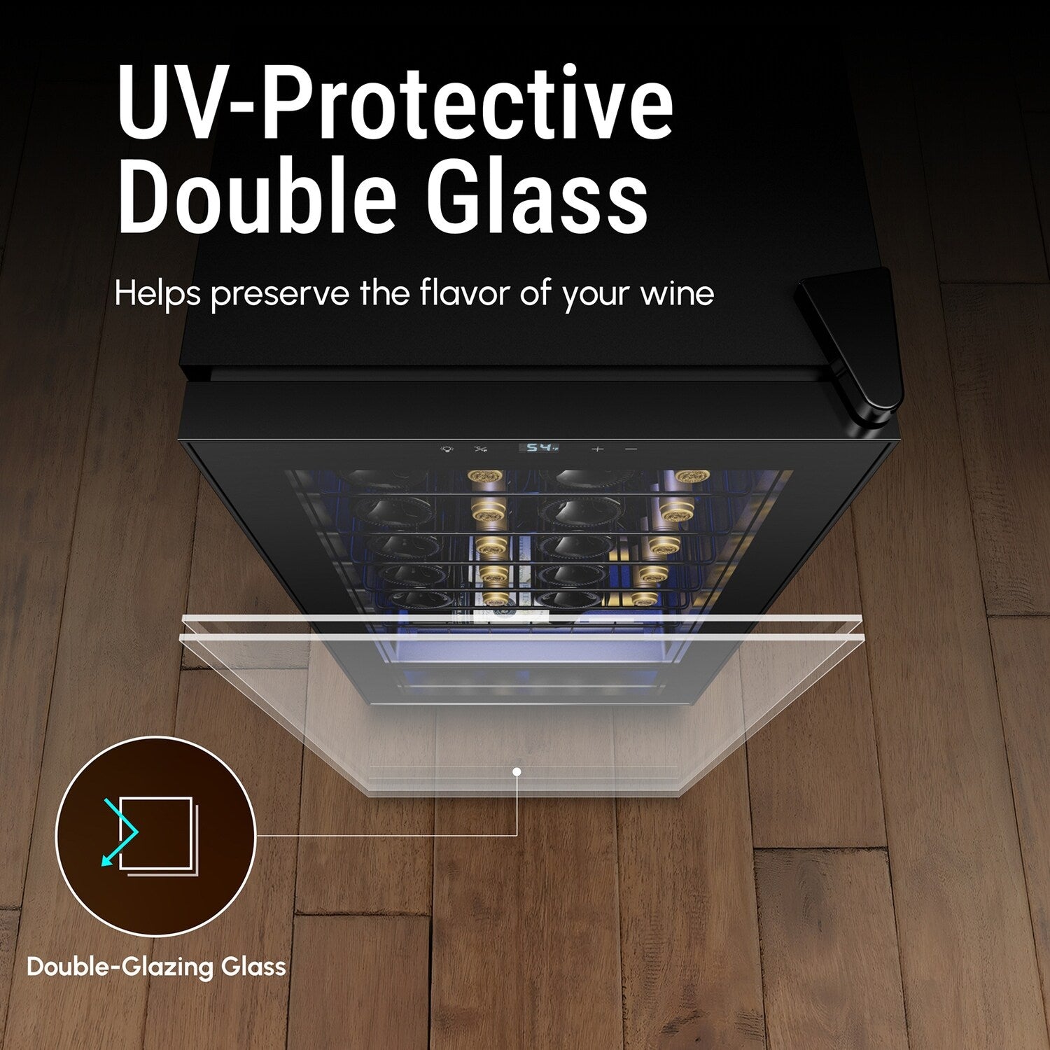 - Preserve the quality of your wine with our UV-protected double-glazed glass door. This feature blocks harmful UV rays, ensuring your wine maintains its perfect taste and aroma.