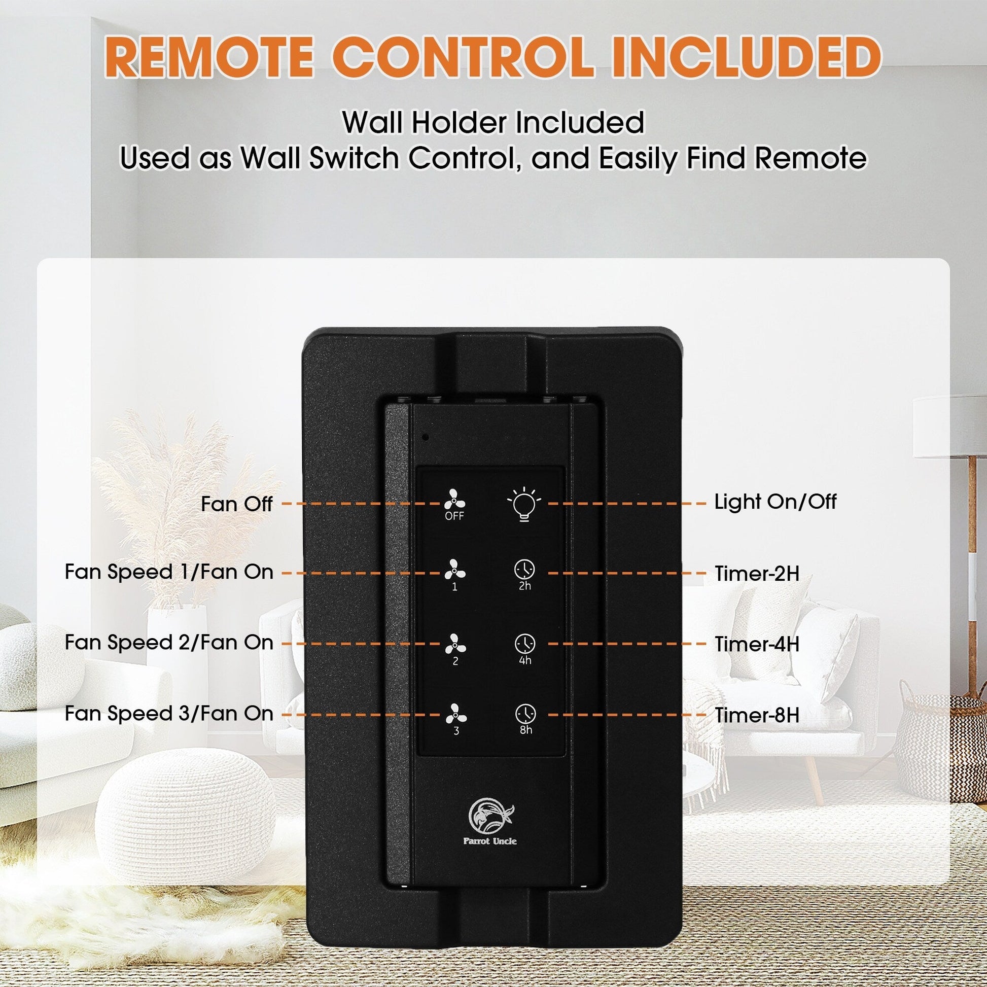 - Handheld remote control included for fan speeds and light on/off seperately