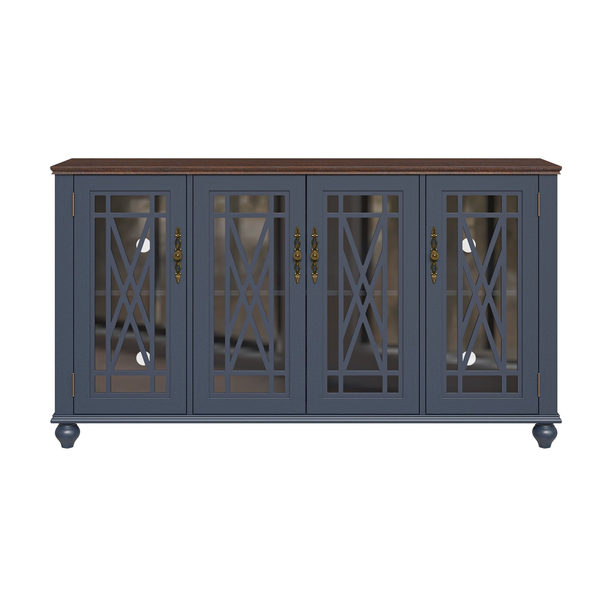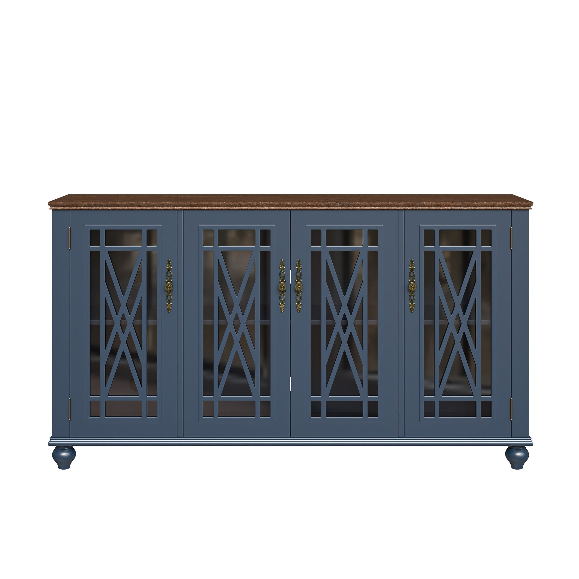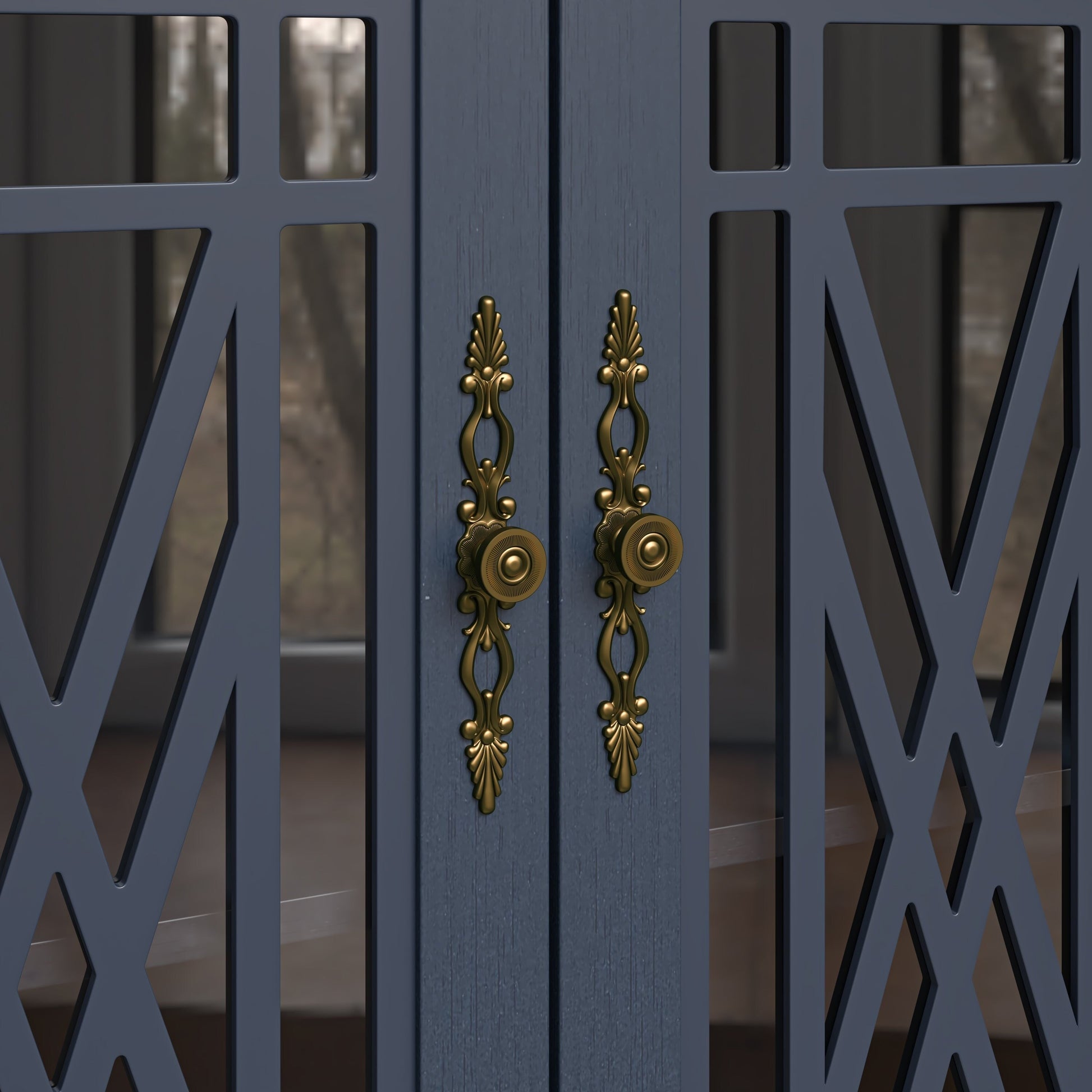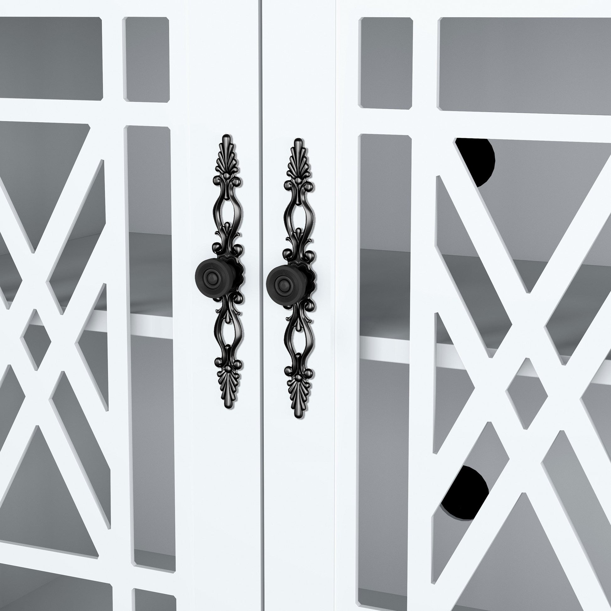 Add a touch of vintage charm to your home with this unique and functional storage cabinet. Made with solid wood and high-grade MDF for long-lasting construction, this cabinet features four glass paneled doors with an intricate wood overlay, and vintage-style metal pulls. With adjustable shelves, this cabinet offers ample storage space that can be customized to fit your needs. Use it as a sideboard in the kitchen or dining room, a console in the living room, or an entryway storage solution. The quick-install hinges make assembly easy and hassle-free..