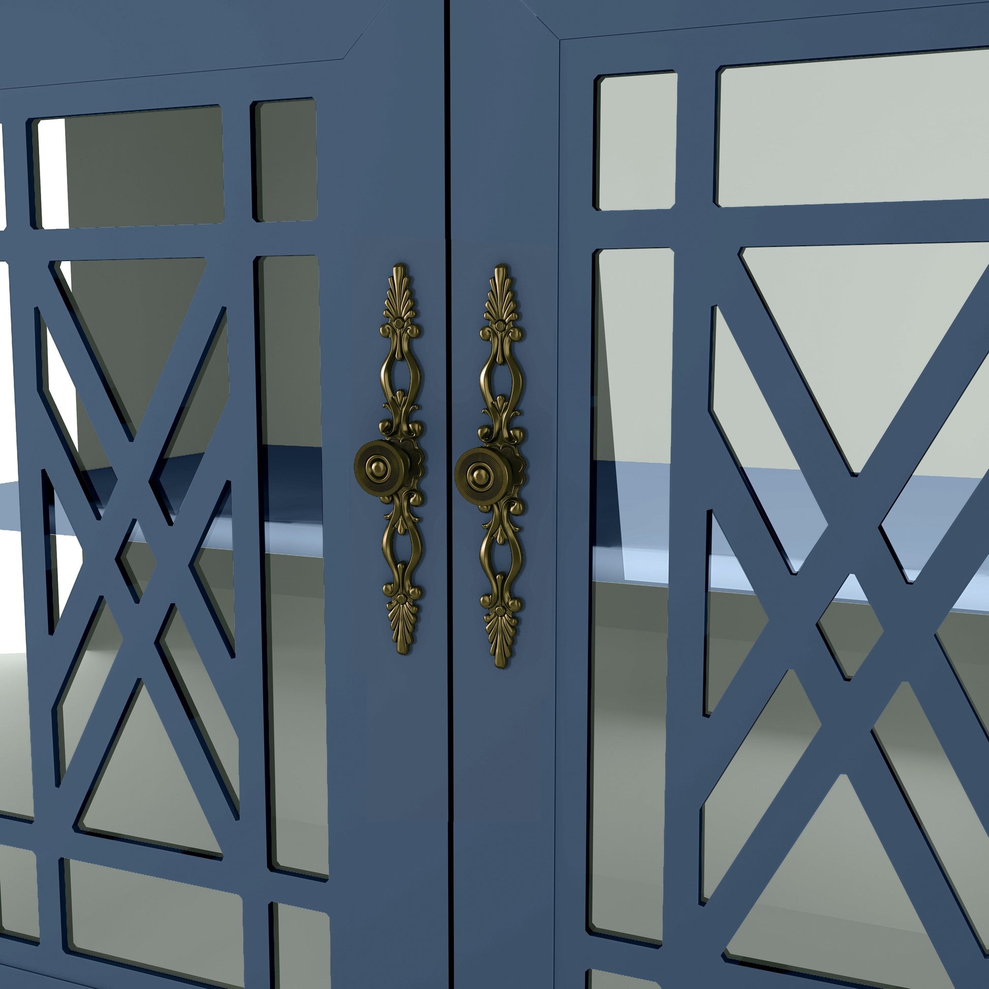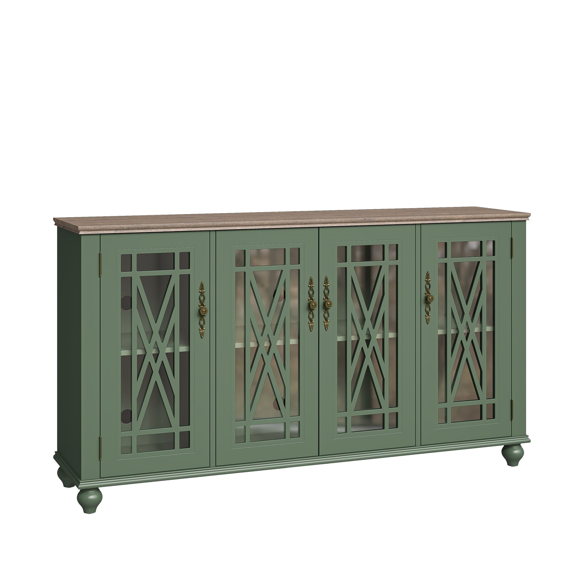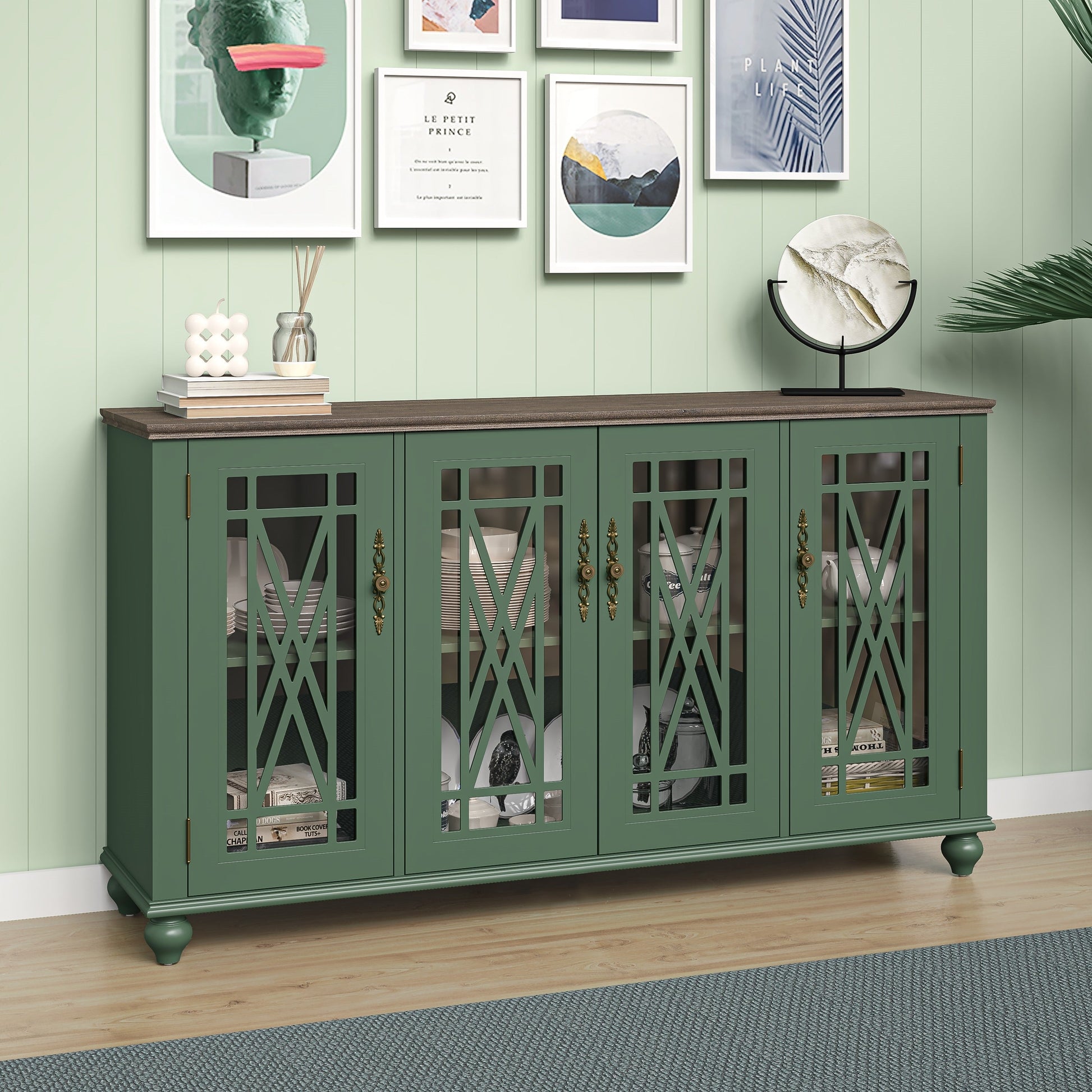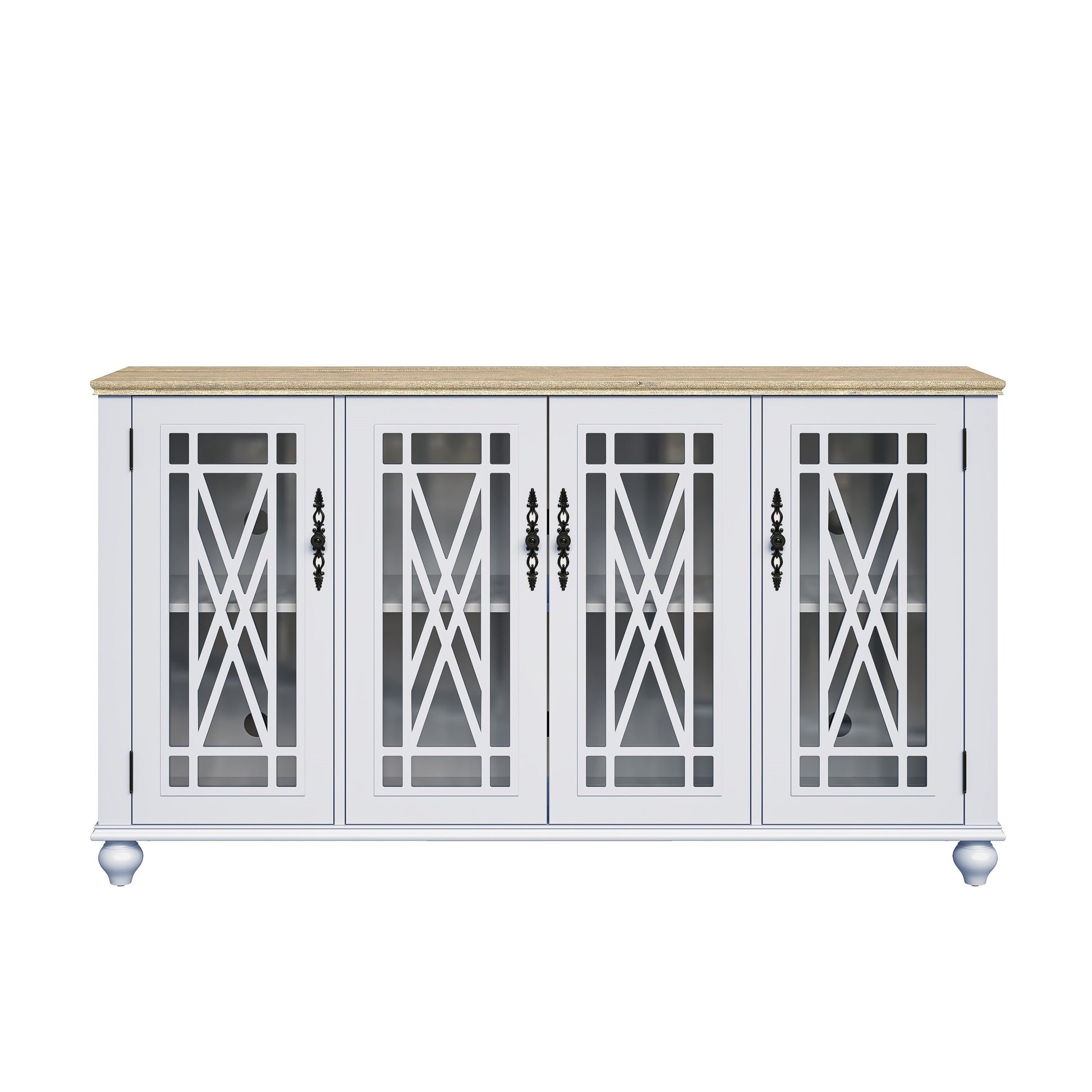 Add a touch of vintage charm to your home with this unique and functional storage cabinet. Made with solid wood and high-grade MDF for long-lasting construction, this cabinet features four glass paneled doors with an intricate wood overlay, and vintage-style metal pulls. With adjustable shelves, this cabinet offers ample storage space that can be customized to fit your needs. Use it as a sideboard in the kitchen or dining room, a console in the living room, or an entryway storage solution. The quick-install hinges make assembly easy and hassle-free..