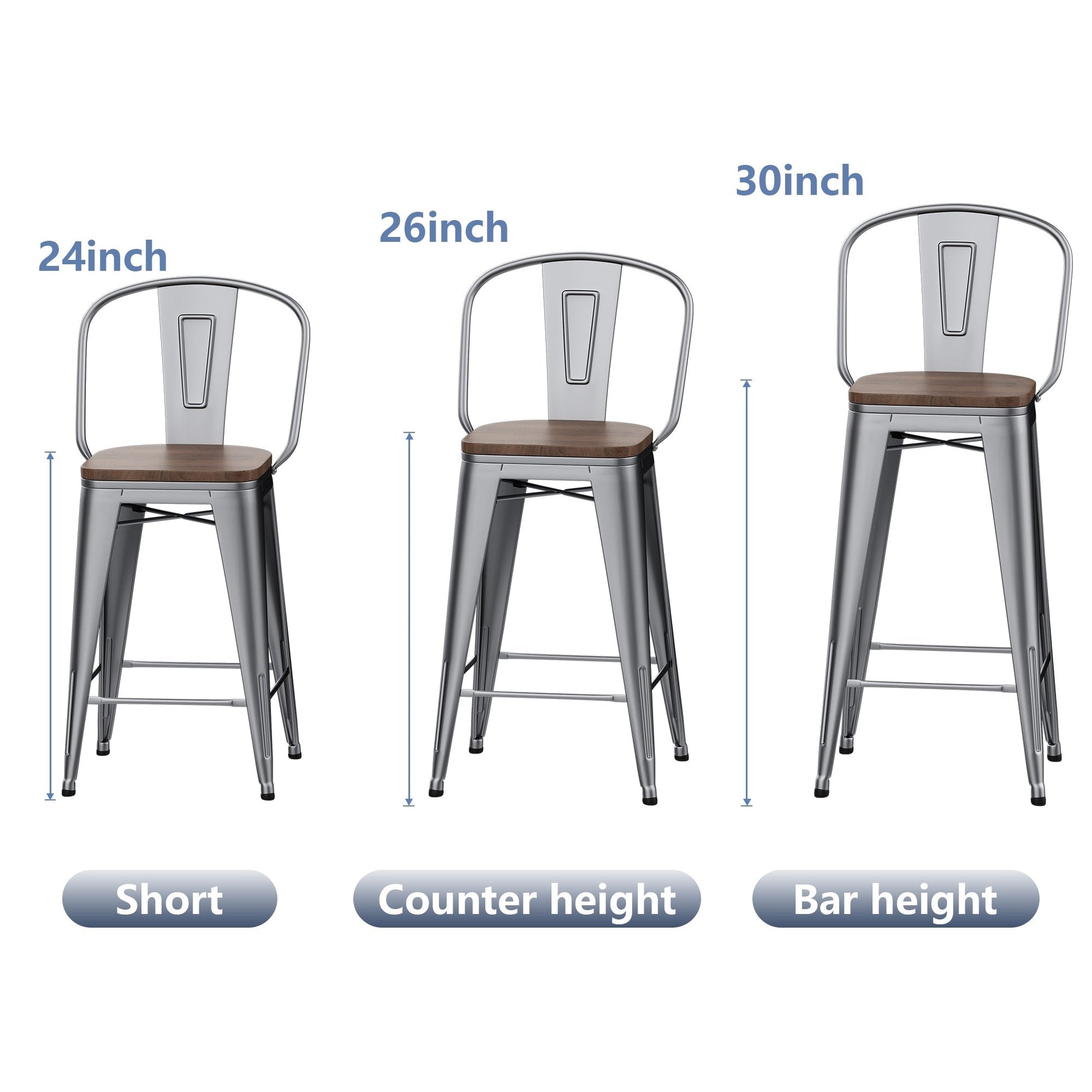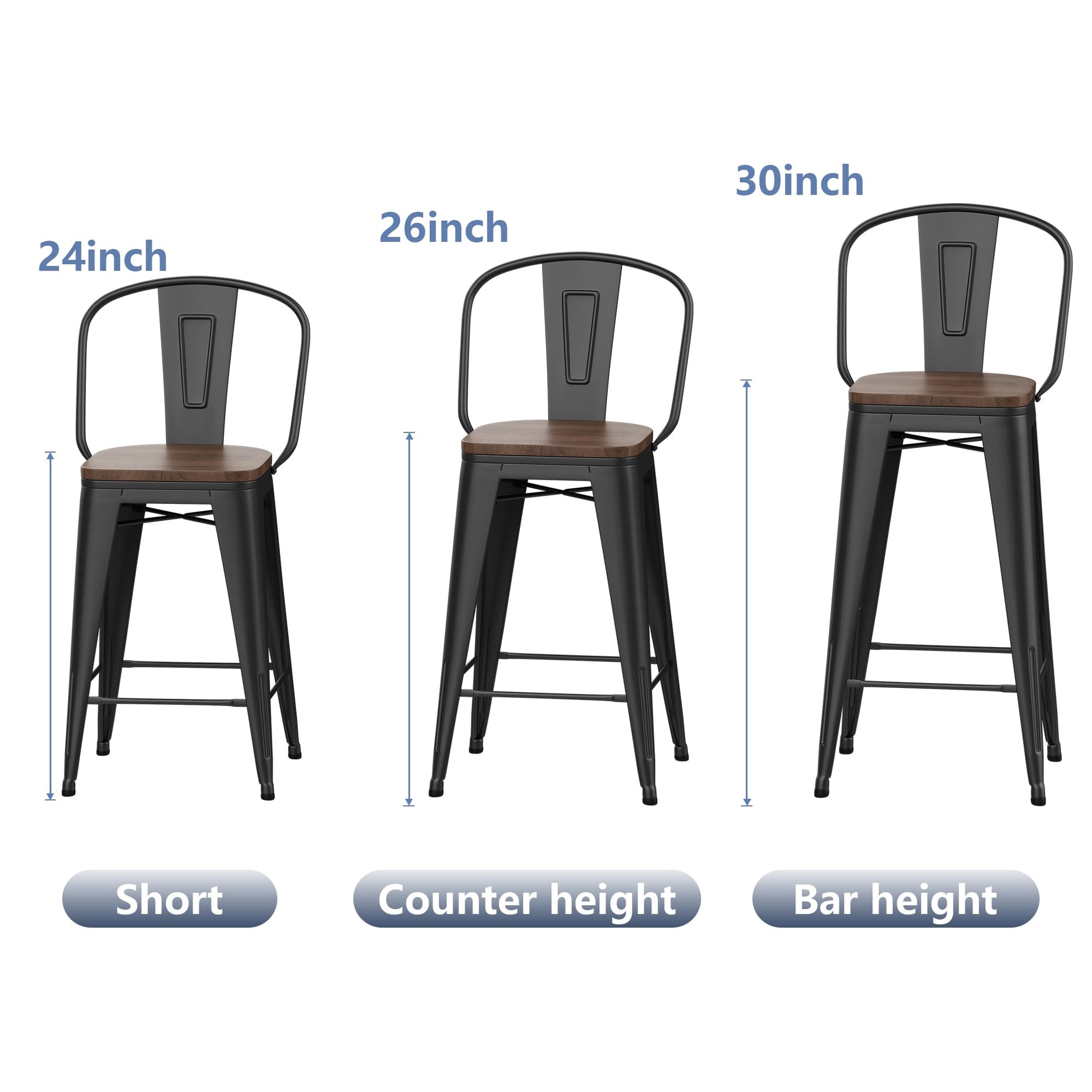 - Available in short (24 inch), counter height (26 inch), and bar height (30 inch)