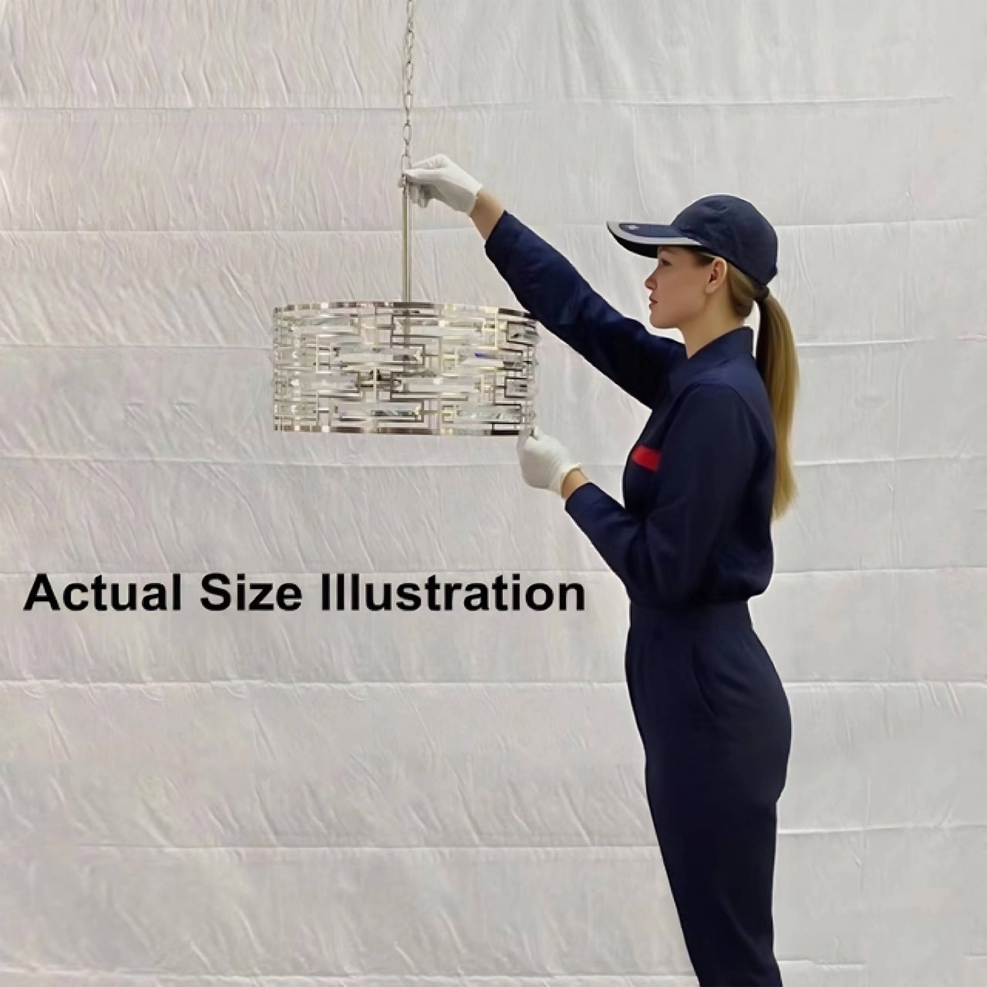 - Fixture: 20 inches in diameter x 18 inches H; Shade: 20 inches in diameter x 8.5 inches H; Ceiling plate: 5.1 inches in diameter x 1 inch H; Max hanging height (from ceiling to the bottom of the light fixture): 59.4 inches, which can be shortened.