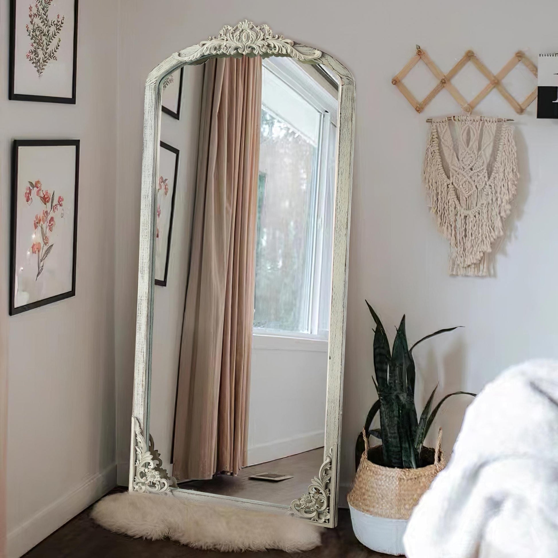 Elevate your room's ambiance with the timeless elegance of this solid wood floor mirror. The arched silhouette and intricate windowpane design create a vintage-inspired optical illusion that enhances your space and adds distinctive character to any decor.
