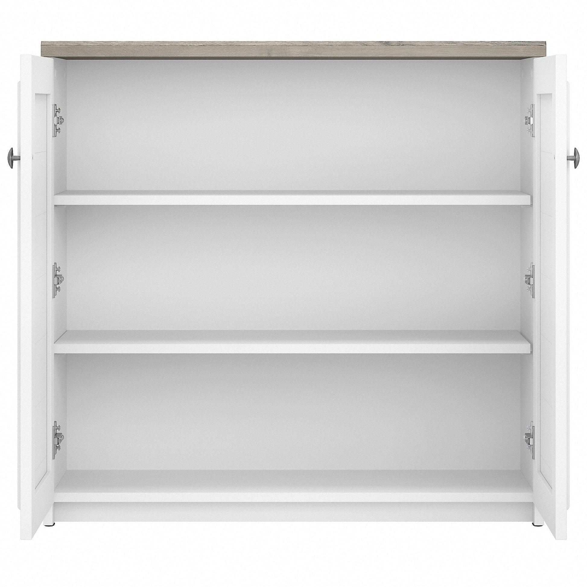 Organize your home office or living space with the Bush Furniture Fairview Small Storage Cabinet with Doors and Shelves. Its modern farmhouse style, with a slightly weathered finish and Antique Pewter hardware, creates a cozy and welcoming atmosphere. The 32W x 13D x 30H cabinet design fits perfectly in small spaces and provides ample storage capacity with three shelves, two of which are adjustable. The louvered cabinet doors add a stylish touch while concealing household items, office supplies, and more. With multiple finish options, including Antique Black with Hansen Cherry accents, Antique White with Tea Maple accents, Pure White with Shiplap Gray accents, or solid Cape Cod Gray, this farmhouse cabinet complements any decor. Tested to meet ANSI/SOHO quality standards for safety and performance, this sturdy cabinet is backed by the Bush Furniture 6 Year Manufacturer's Warranty.