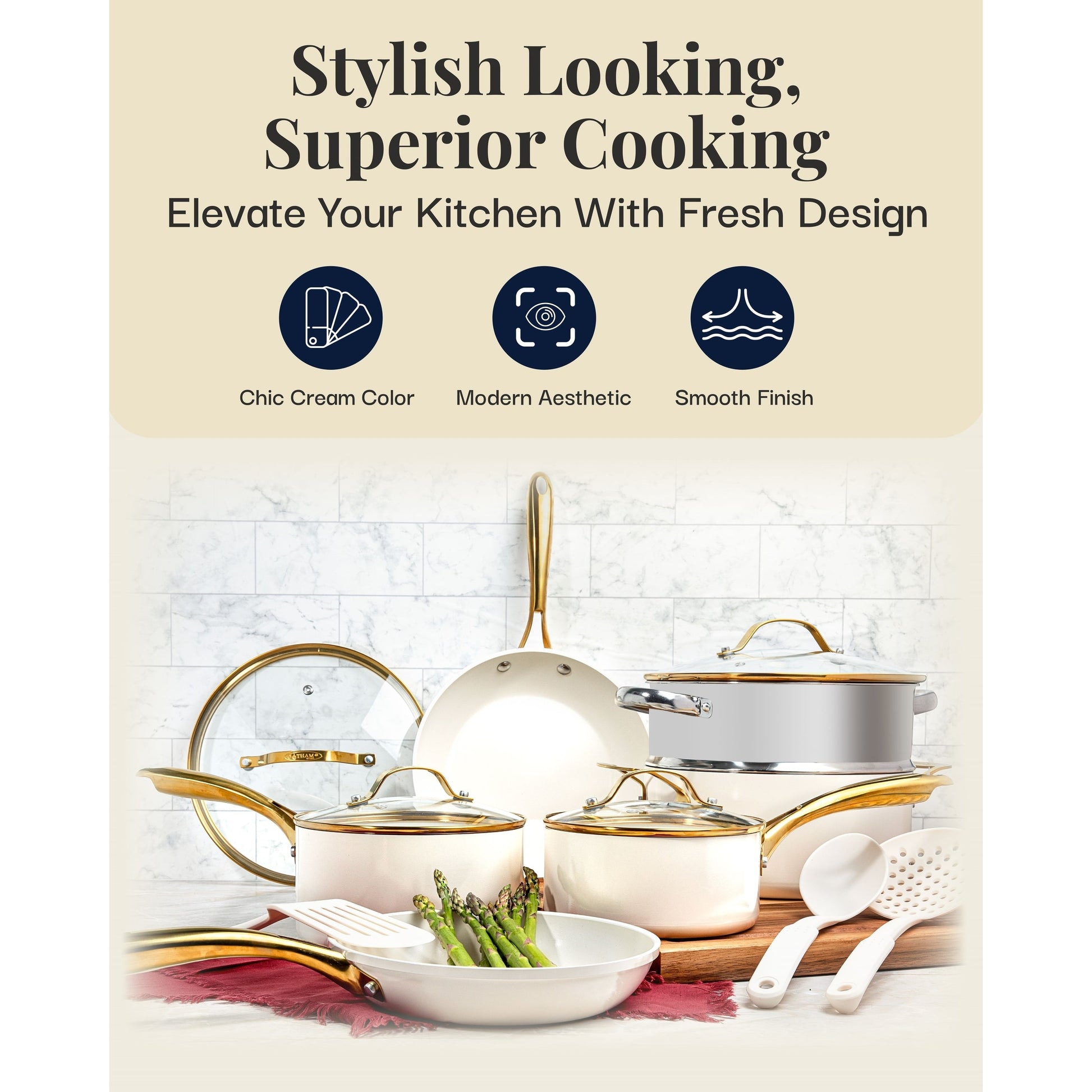 - Elegant Cream Finish with Gold-Tone Accents: The modern cream-colored exterior and luxurious stainless steel gold-tone handles add a sophisticated touch to any kitchen, blending style with practicality.