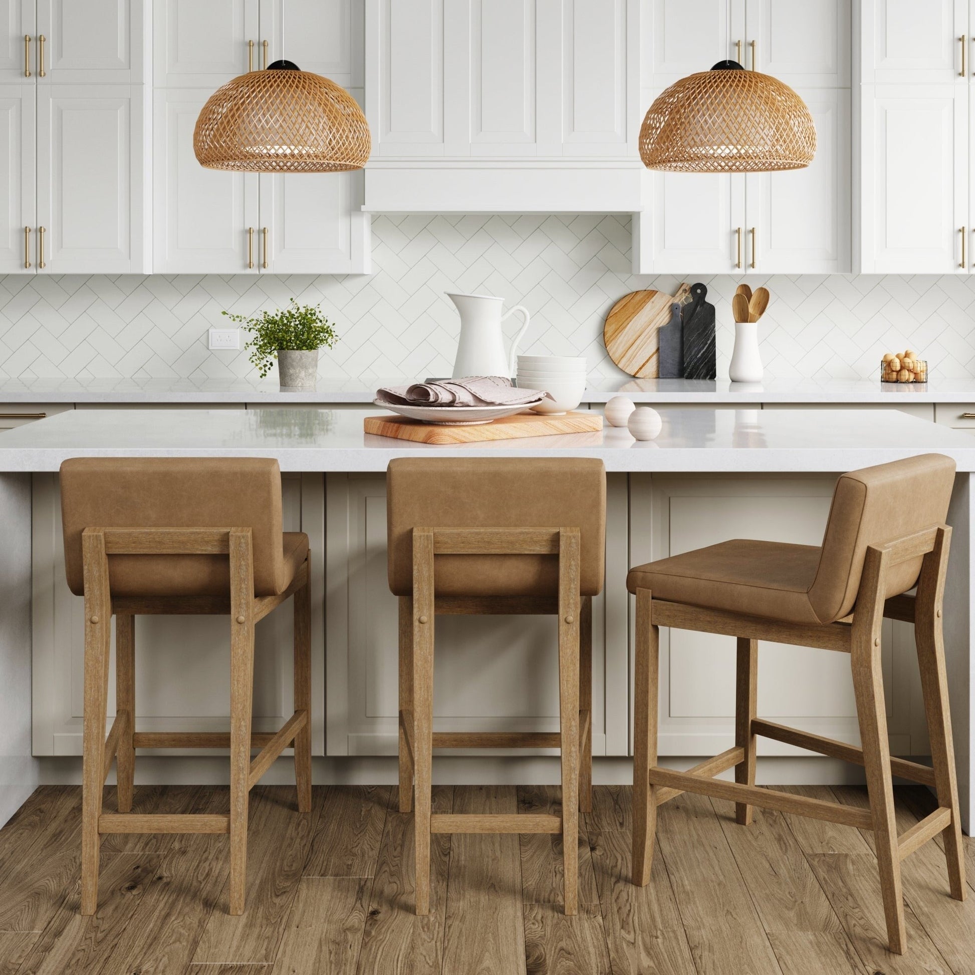 - Gracie features a brushed wood wash on its solid legs and boucle fabric or faux leather upholstery, making it a suitable addition to your modern or farmhouse style kitchen.