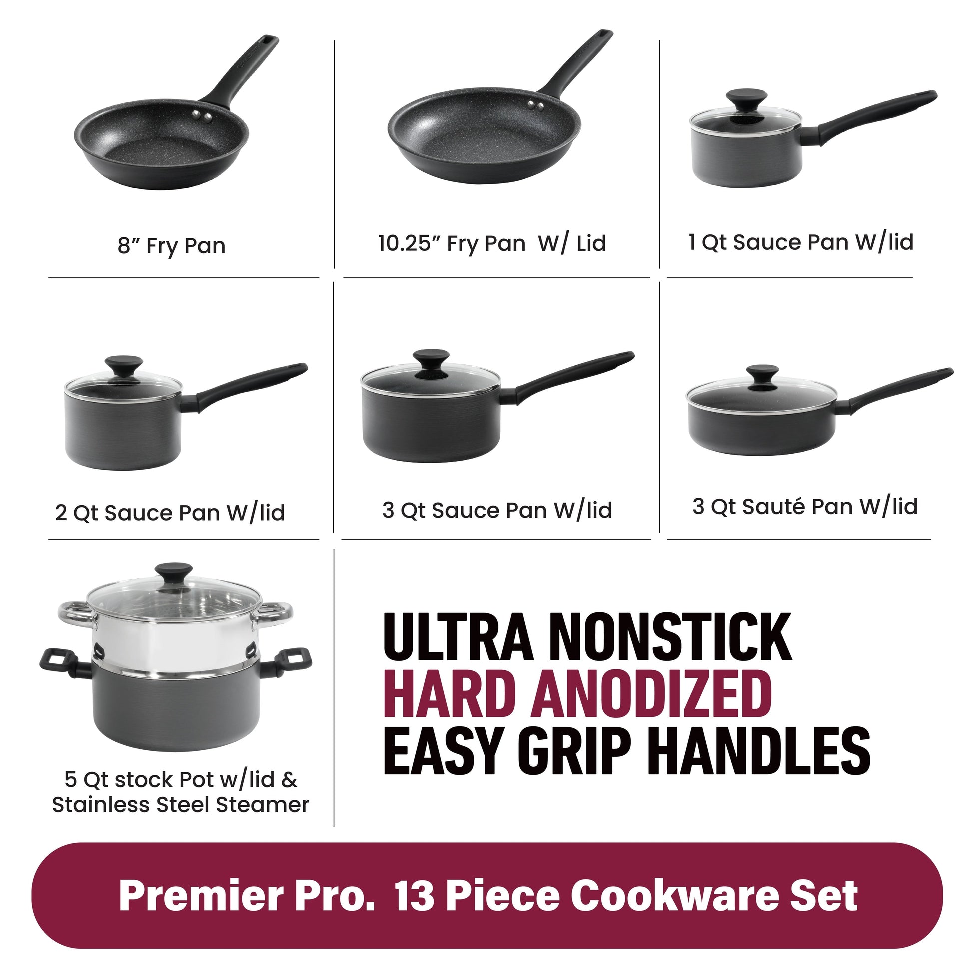 - Complete 13 Piece Set: Includes 8” skillet, 10.25” fry pan with lid, 1.5 qt, 2 qt, and 3 qt saucepans with lids, 3 qt sauté pan with lid, 5 qt stock pot with lid, and stainless steel steamer insert for a comprehensive kitchen solution.