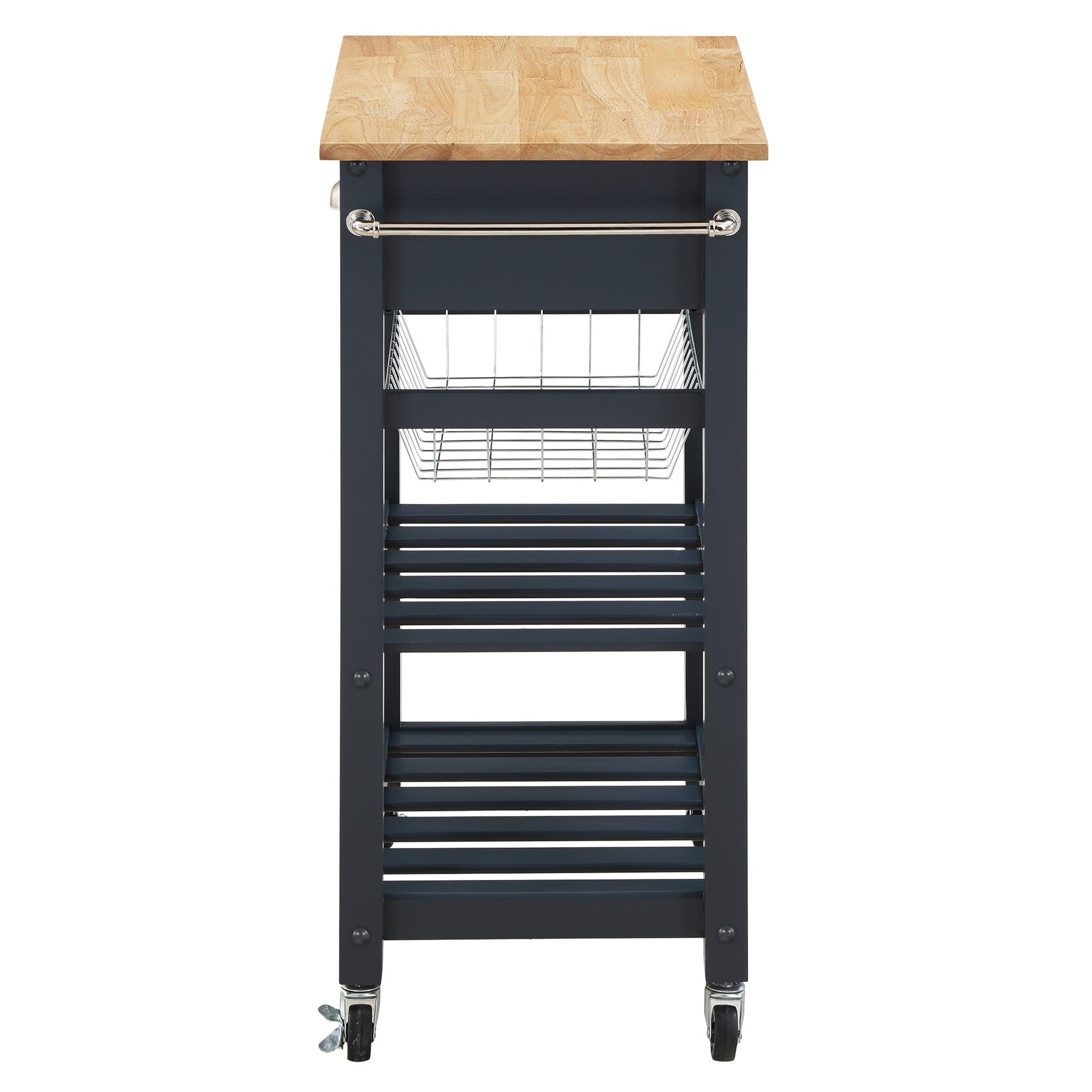 A flawless solution for space-saving homes and apartment living, our Kitchen Cart with Wood Top, combines beauty and functionality. Its multi-functional design makes it perfect for food preparation, serving, and kitchen storage. Beautiful from every angle, it features a solid wood painted finish, contrasted with the clean lines of a durable wood food prep surface. A top drawer will hold all your cooking utensils, while the charming pull-out basket will hold your fresh produce or kitchen linens. Two slatted open shelves are ideal for large pot storage and display. The handy towel bar, heavy-duty hardware and locking casters, provide long lasting appeal. A must-have addition to any home, this charming kitchen cart is sure to be your new favorite place for both cooking and stowing away countertop clutter.