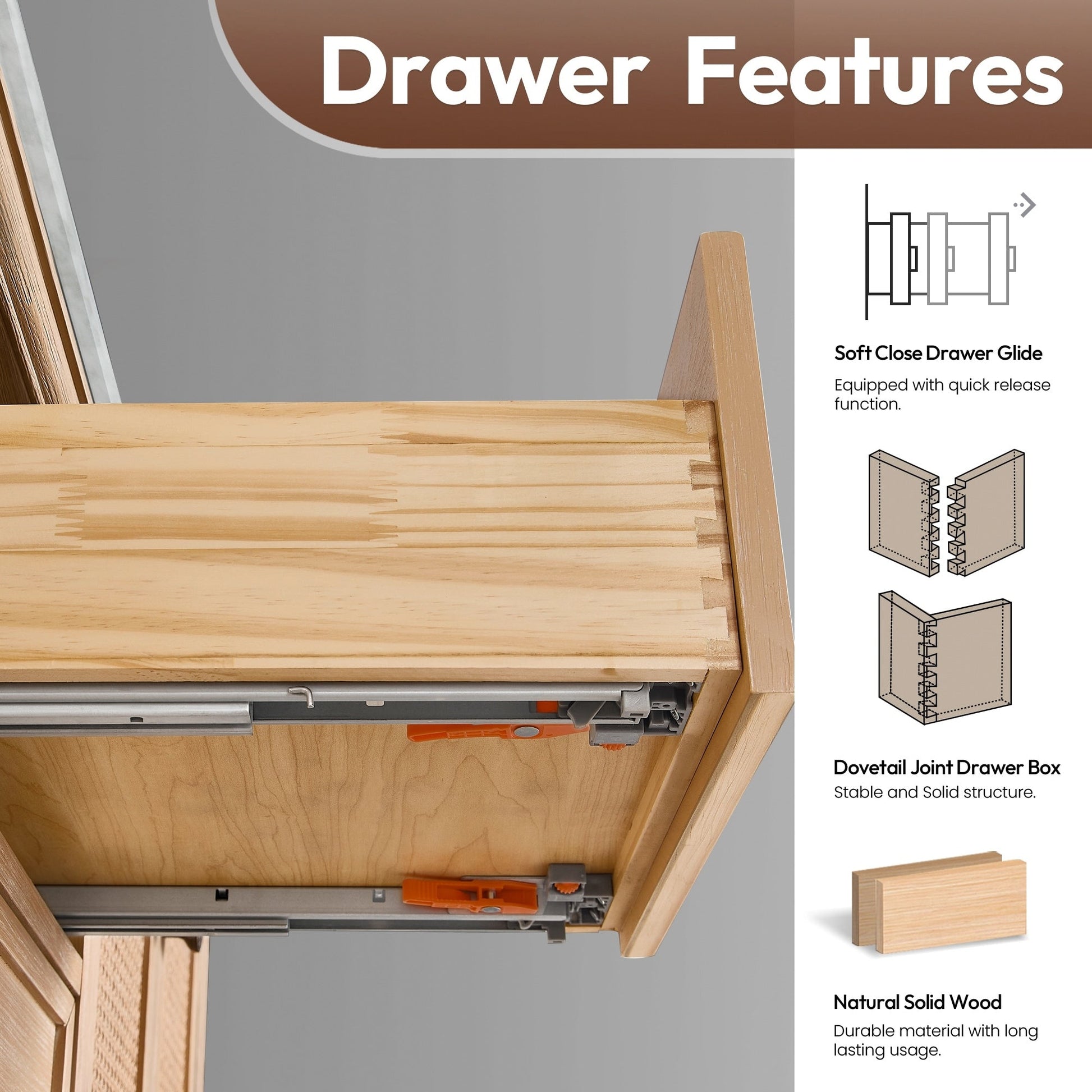 48 inch - Two soft-closing doors with a rattan bamboo panel and six sturdy, soft-closing dovetail drawers.