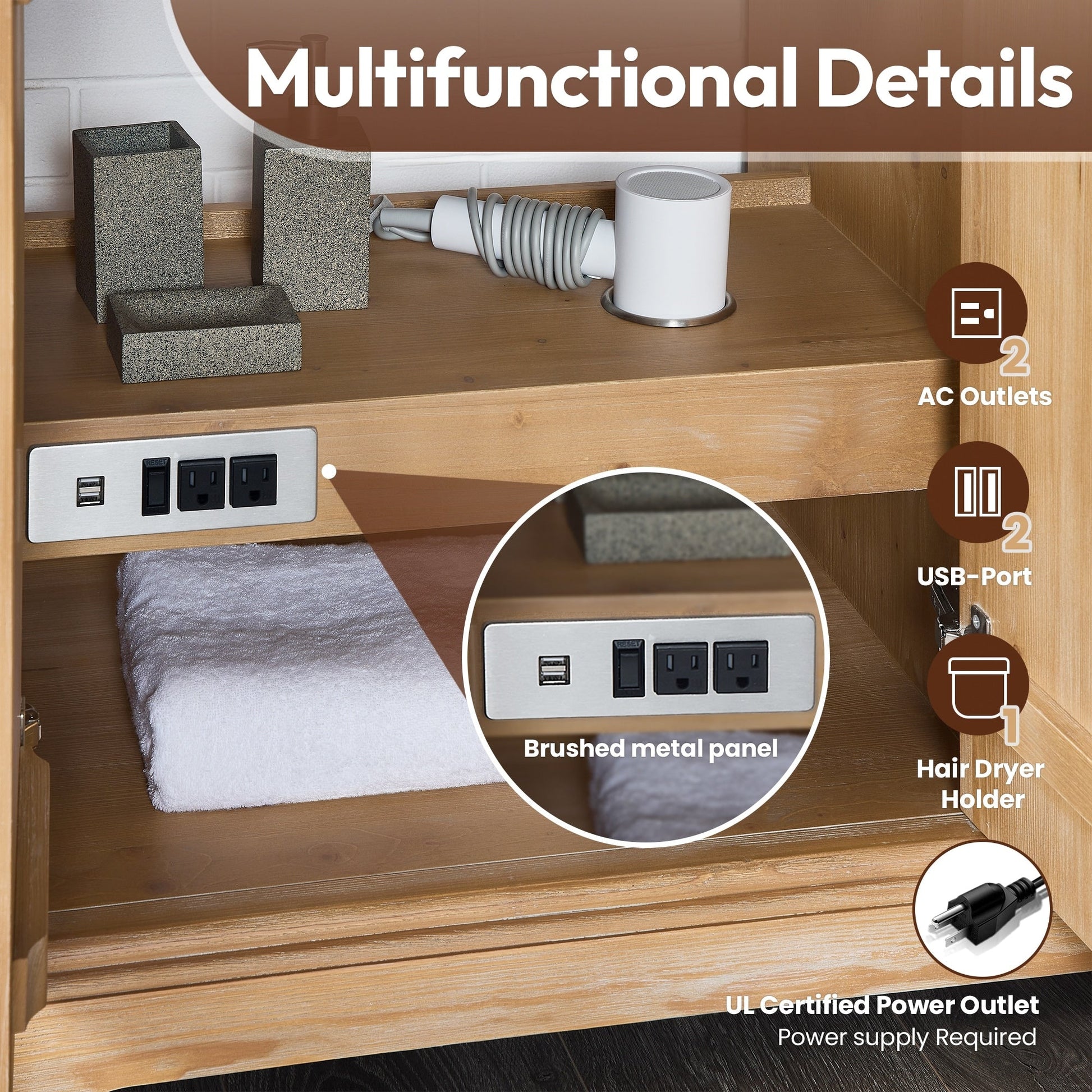 · Practical Functionality: Built-in UL-listed power and USB outlets offer a practical way to power beauty and grooming appliances. Includes convenient hair dryer organizer that keeps your favorite tool within easy reach.