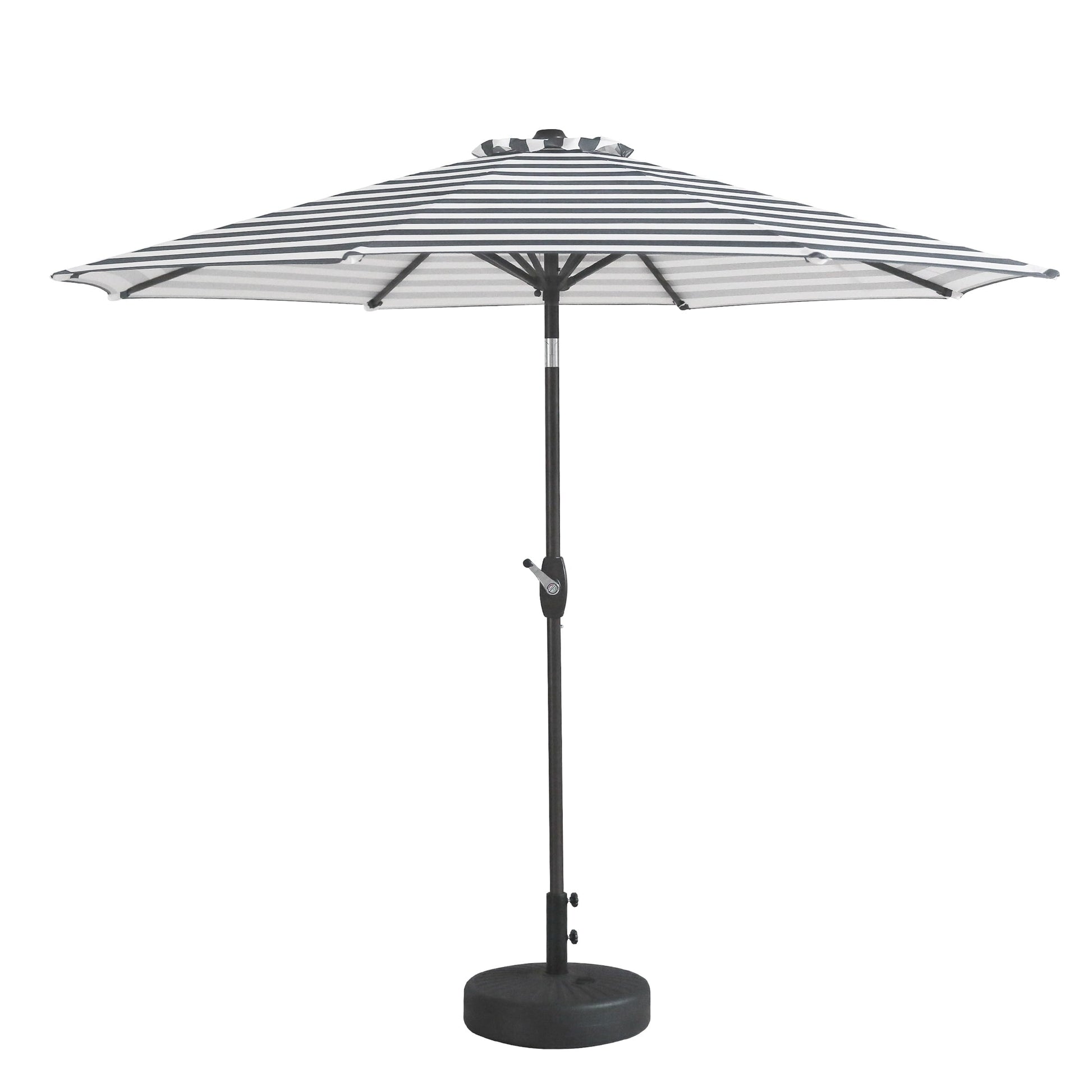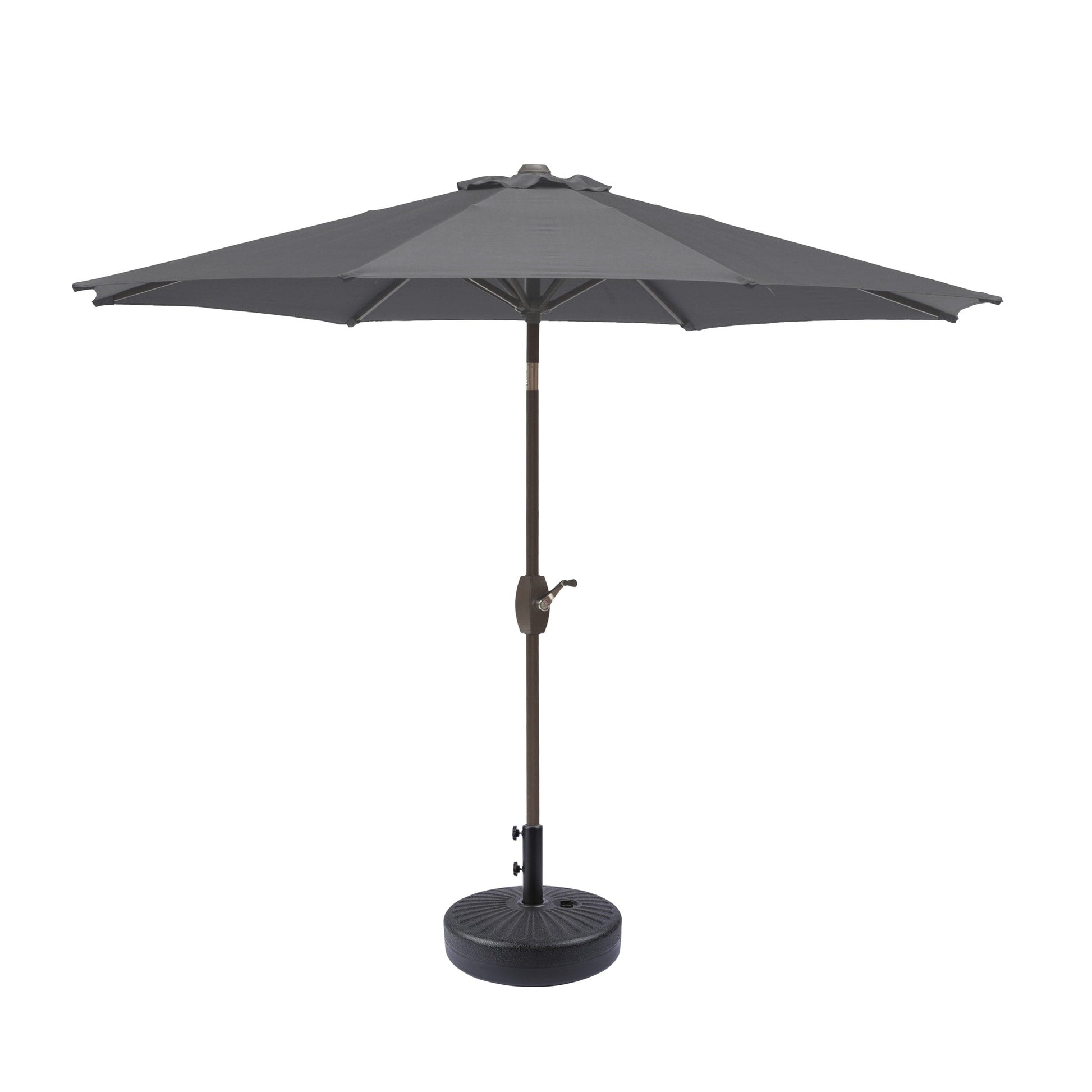 Add some shade to your home with this essential umbrella and fillable base weight set!. Designed with style and durability in mind, this piece is built with an 8 rib steel frame. The polyester fabric blocks up to 95% of UV rays to keep yourself while being fade and water resistant. A push-button tilt mechanism lets you adjust as you please, so you can get just the right amount of sun! The best part is, both are easy to setup and to clean!