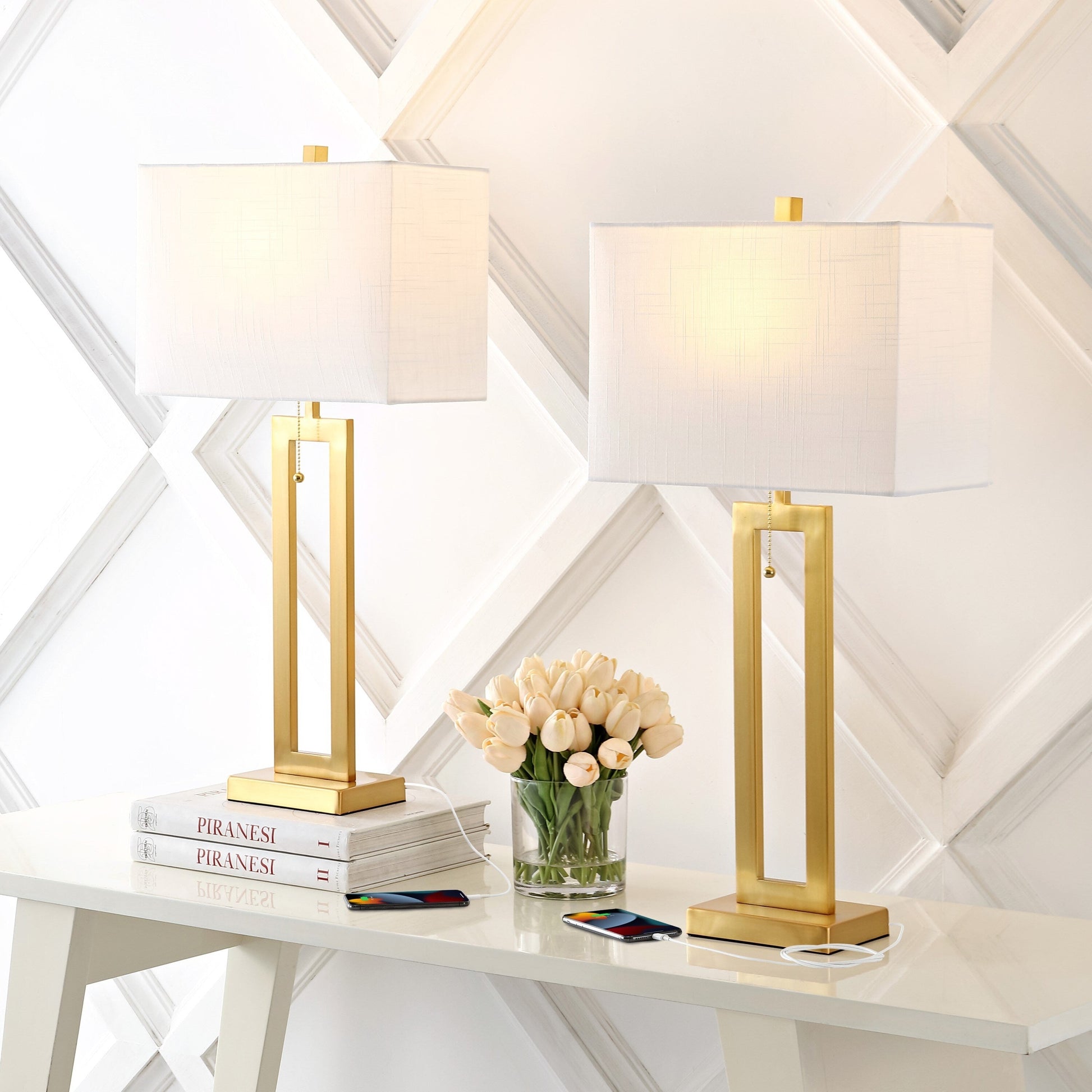 A sleek metal finish and square linen shades give this pair of lamps a clean, modern look. Perfect for resort and office interiors, each lamp includes a USB port and LED bulb for bright, warm light. Use these geometric lamps to add understated style to a bedroom, living room, or entry console.
