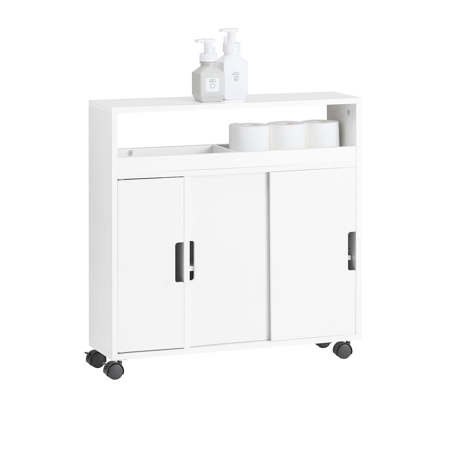 Ce meuble de rangement à portes coulissantes et étagère intérieure réglable est idéal pour ranger le papier toilette, le détergent, etc.