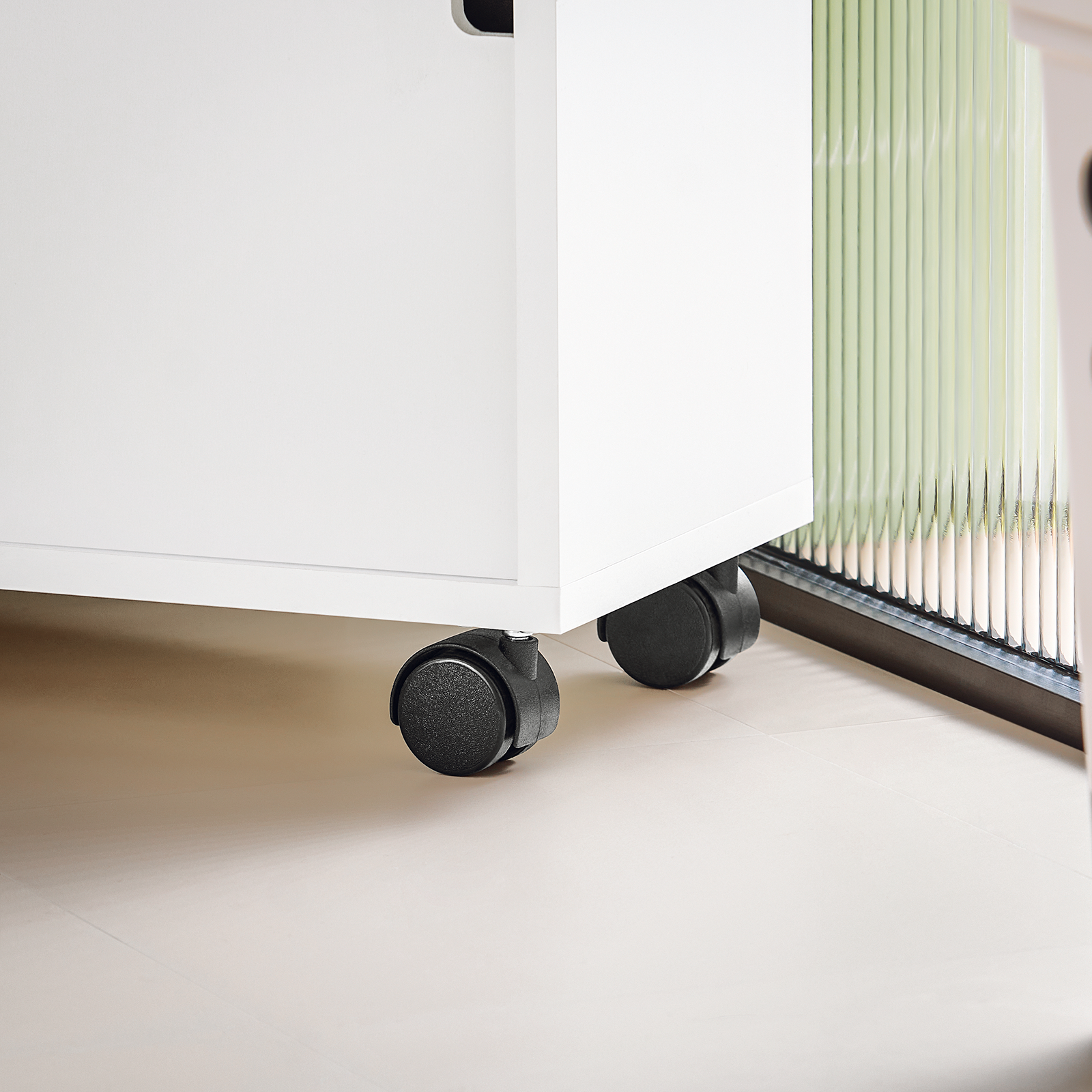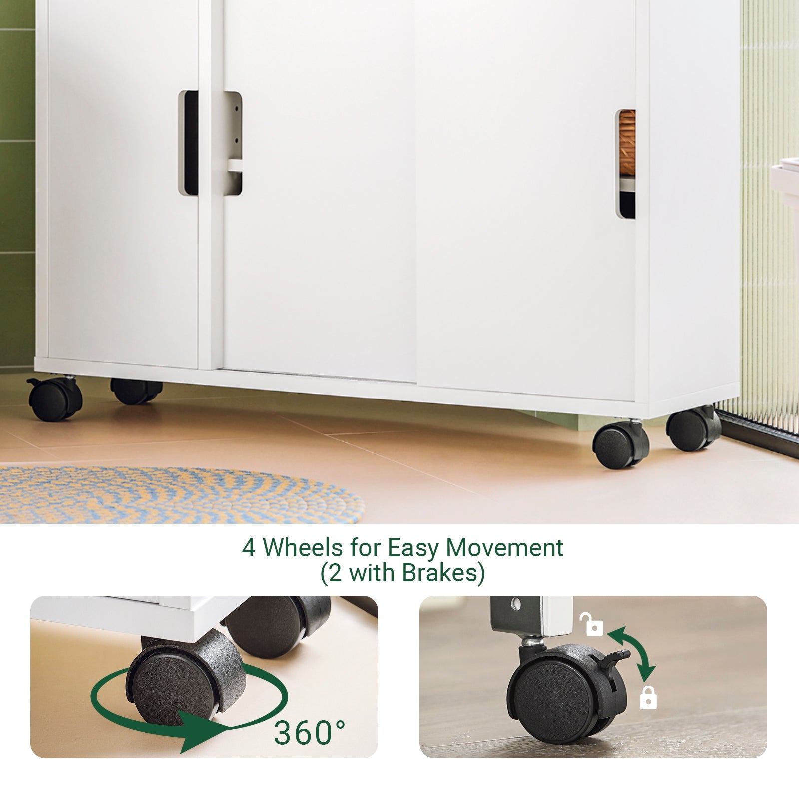 4 roulettes pivotantes (dont 2 avec frein) pour faciliter le déplacement.