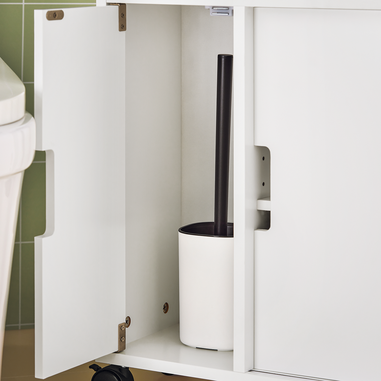 Le meuble situé à gauche est conçu pour ranger la brosse de toilette et son support.