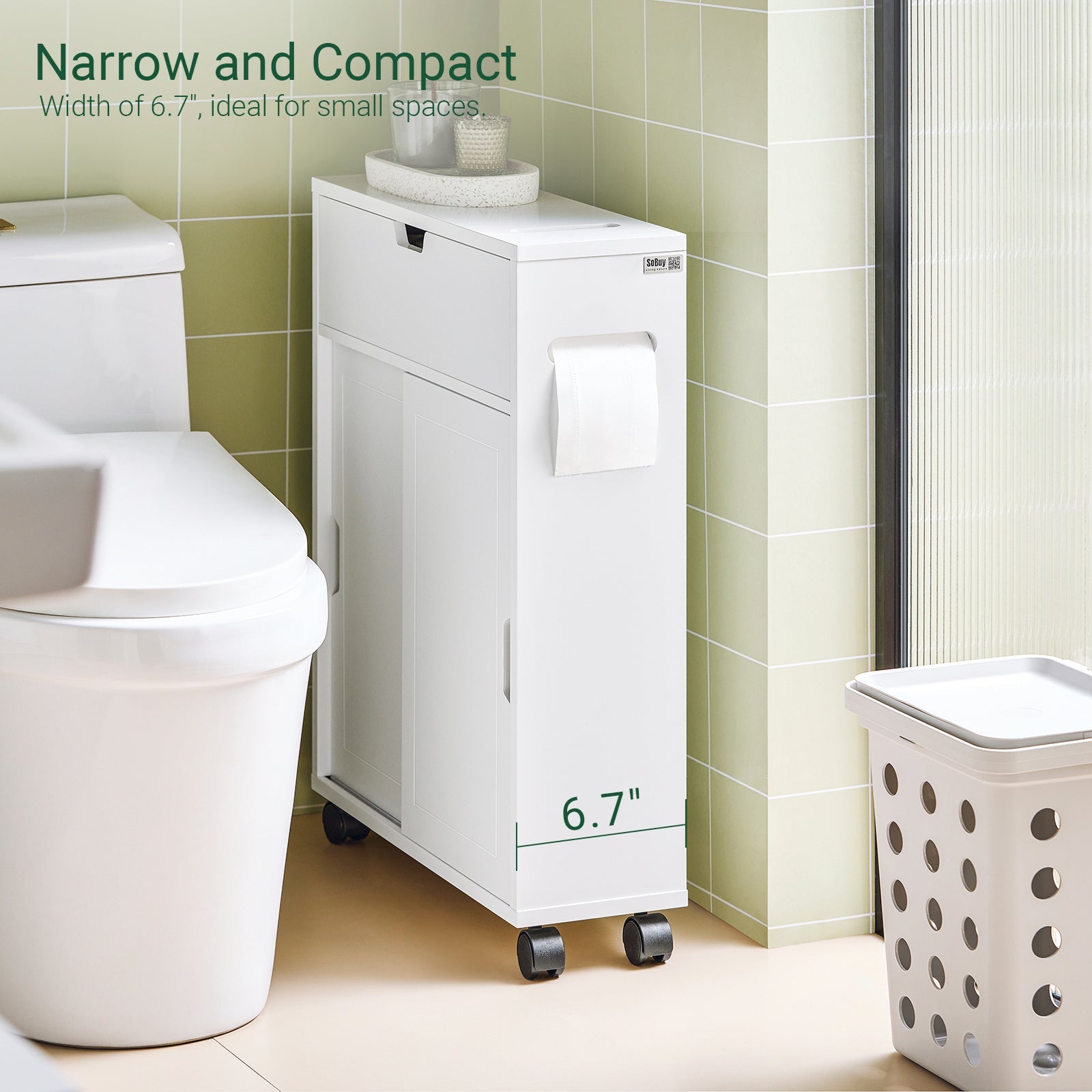 Ce meuble de rangement à portes coulissantes et étagère intérieure réglable est idéal pour ranger le papier toilette, le détergent, etc.