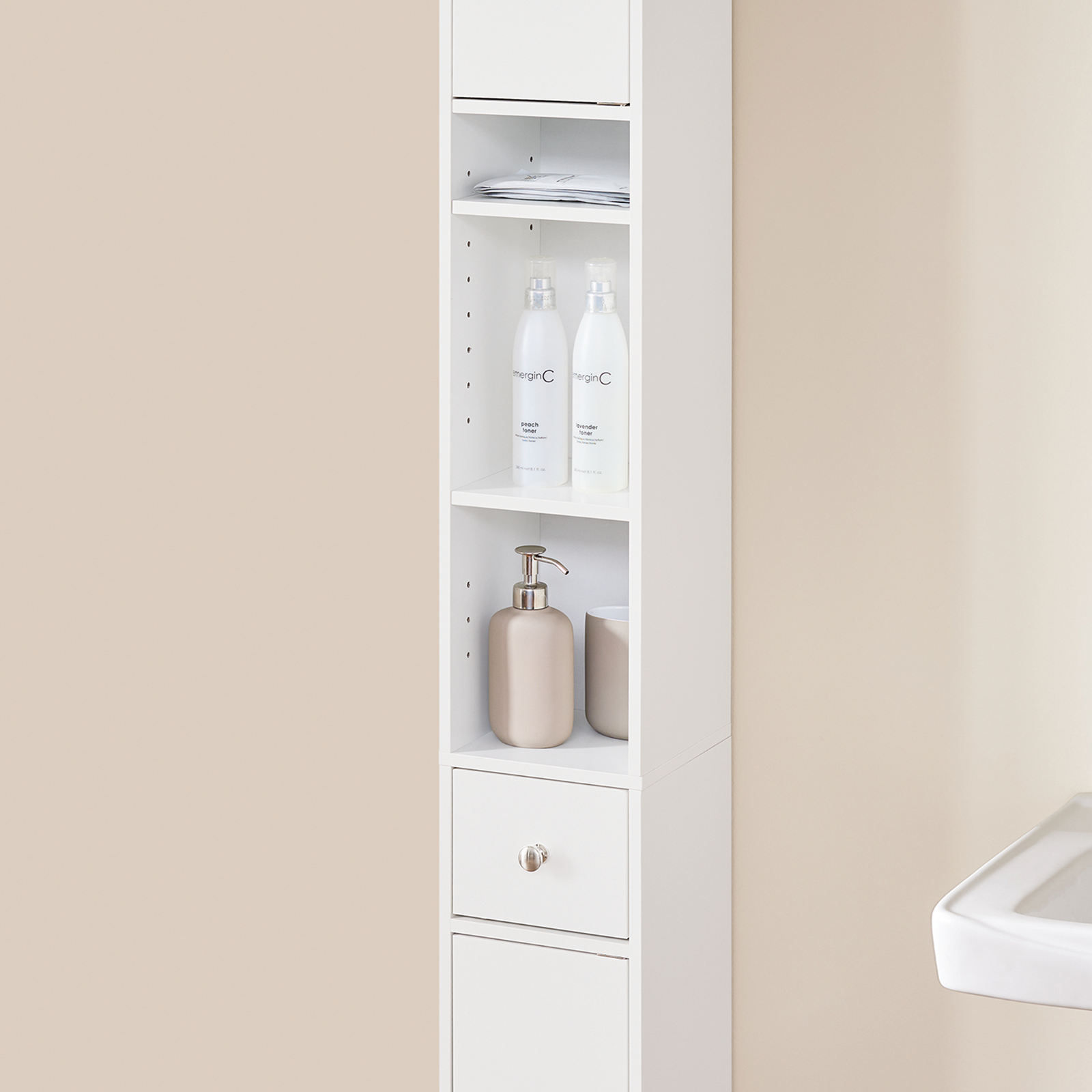 Il comporte 1 tiroir, 2 portes et 5 compartiments de rangement pour assurer un espace de rangement suffisant pour tous vos produits de salle de bain.