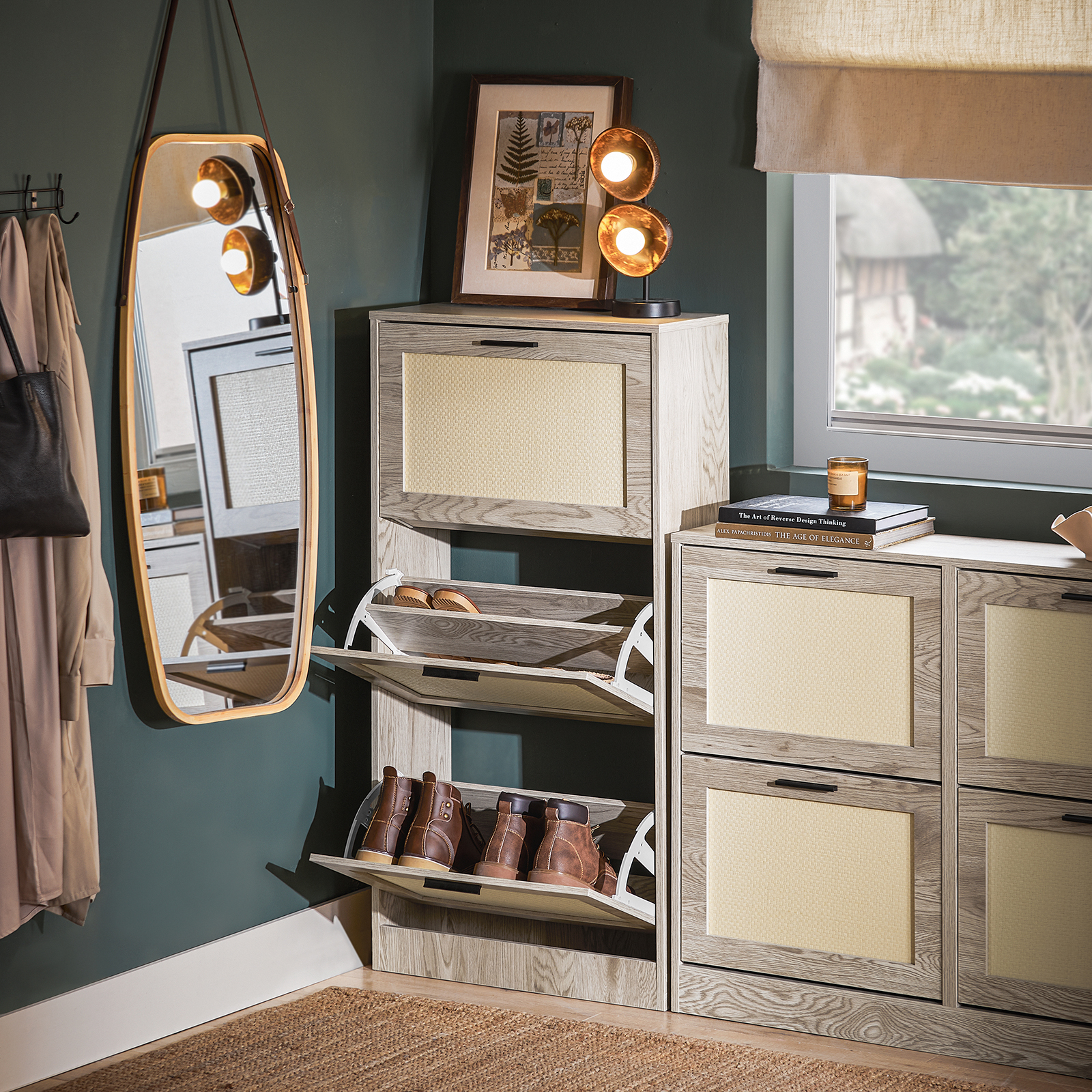 Il comprend un compartiment de rangement pour chaussures composé de 2 tiroirs à charnières. Chaque tiroir dispose de 2 rangées d'emplacements.